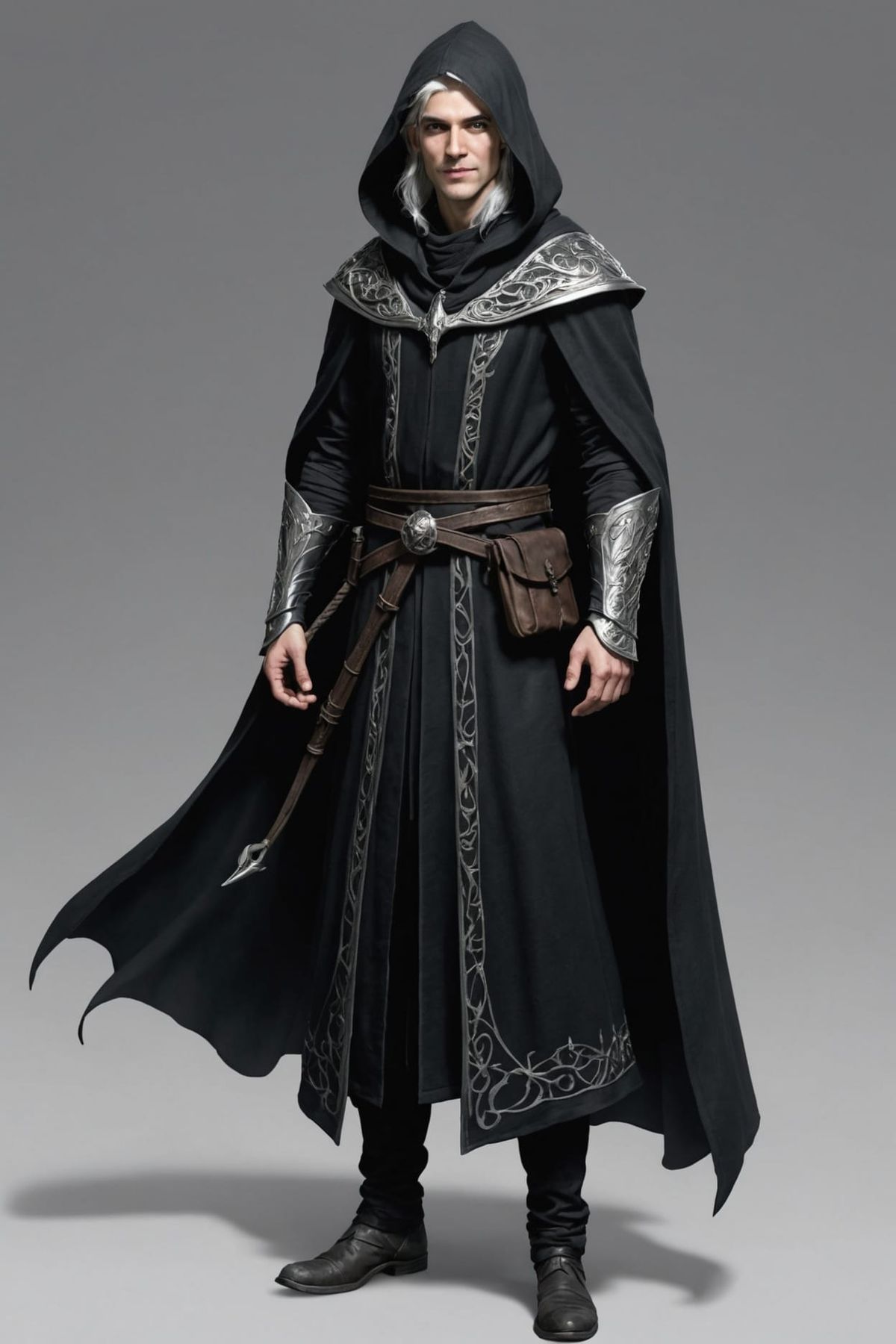 This image shows a sinister young elf with silver hair and eyes, wearing a dark hooded robe. The figure evokes the image of a grim reaper, but without a weapon.