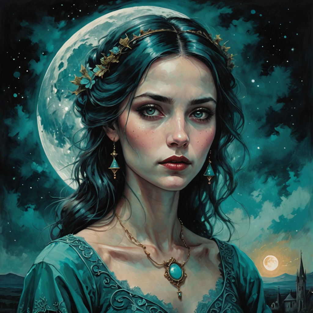 "Whimsigothic woman wearing a turquoise dress, against a dark turquoise sky, full moon"