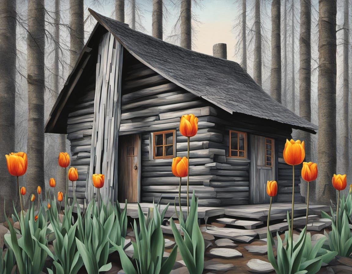 This image showcases an abstract surrealist painting depicting a totem pole and log cabin in a Norwegian wood, with a laser broom and mint tulip elements.