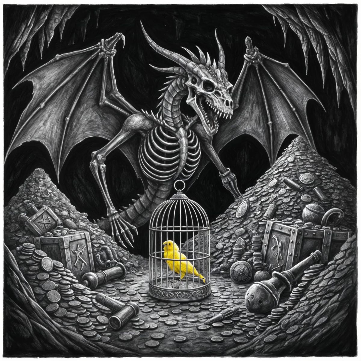 This image shows a monochromatic charcoal drawing of a skeletal dragon pirate protecting a vast treasure. A single, vibrant canary provides the only color in the scene, creating a macabre and dramatic mood.