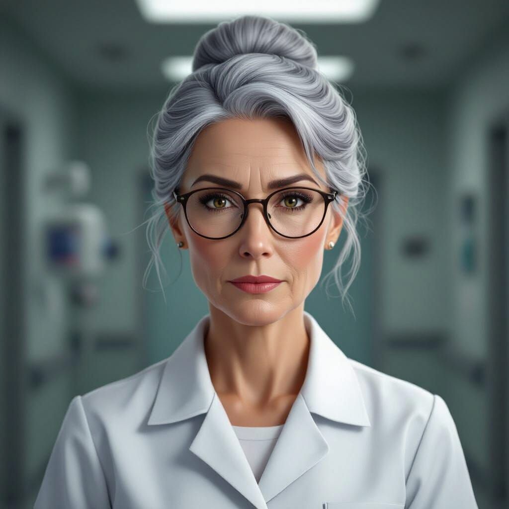 A portrait of a 60-year-old head nurse with gray hair and glasses. She has a serious but caring expression and shows subtle fatigue. The image is rendered in a semi-realistic comic style reminiscent of 3D anime art.