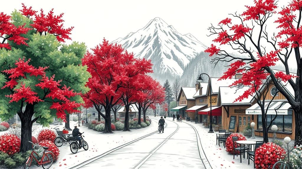 This vibrant winter scene depicts a bustling park with lush trees, snow-capped mountains, and quaint shops, set against a soft white background with bold black outlines and textured brushstrokes, blending traditional and digital media aesthetics.