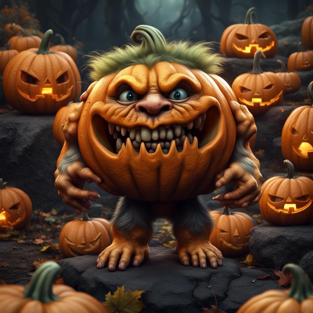 A digital painting of a cute troll in a Halloween pumpkin costume. This fantastical image features intricate details, complementary colors, and a deep color palette, rendered in 8k resolution.