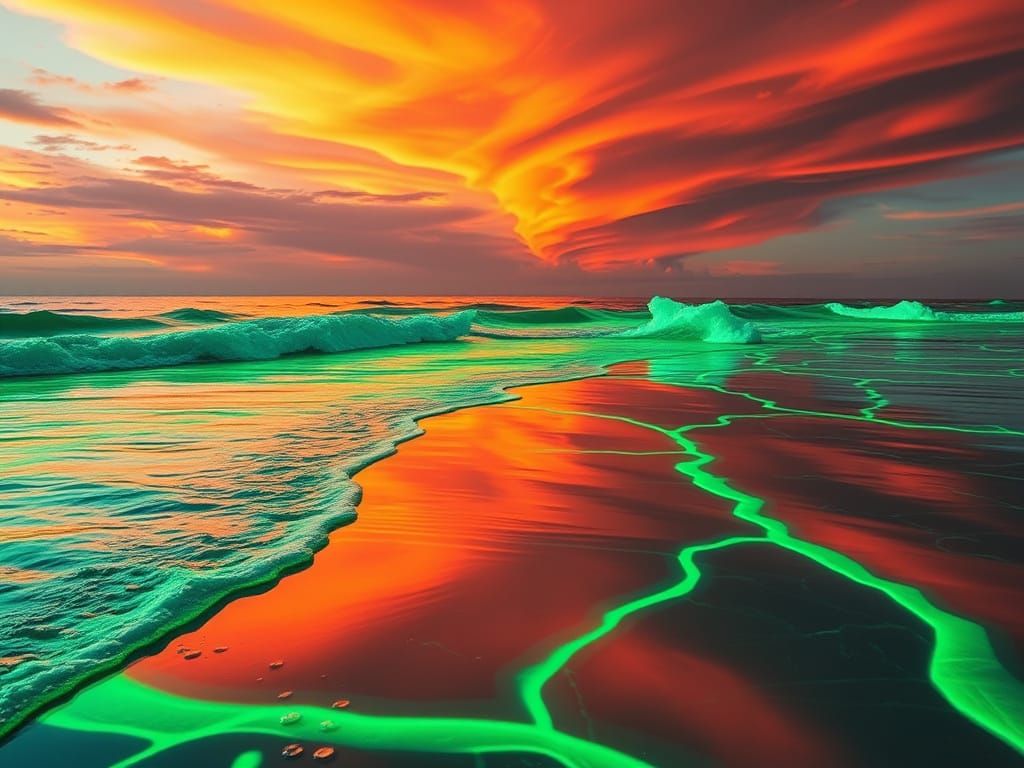 This image shows a surreal seascape with a neon orange sky reflected in neon green surf. The colors and reflections create a hypnotic, dreamlike pattern.