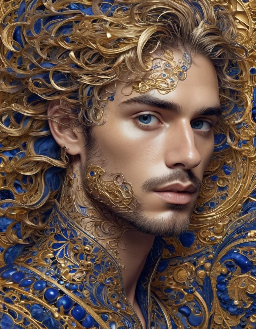 A captivating close-up abstract portrait of a handsome man. His hair and clothing feature fluid, wave-like patterns in deep blues and rich golds, with metallic gold accents as vector art.