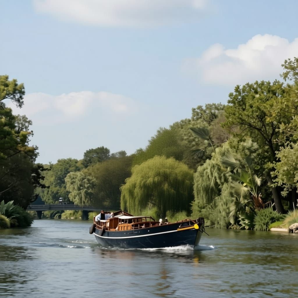 This image depicts a unique sailboat without a mast sailing serenely down a tree-lined canal. The plane trees create a picturesque and tranquil waterscape.