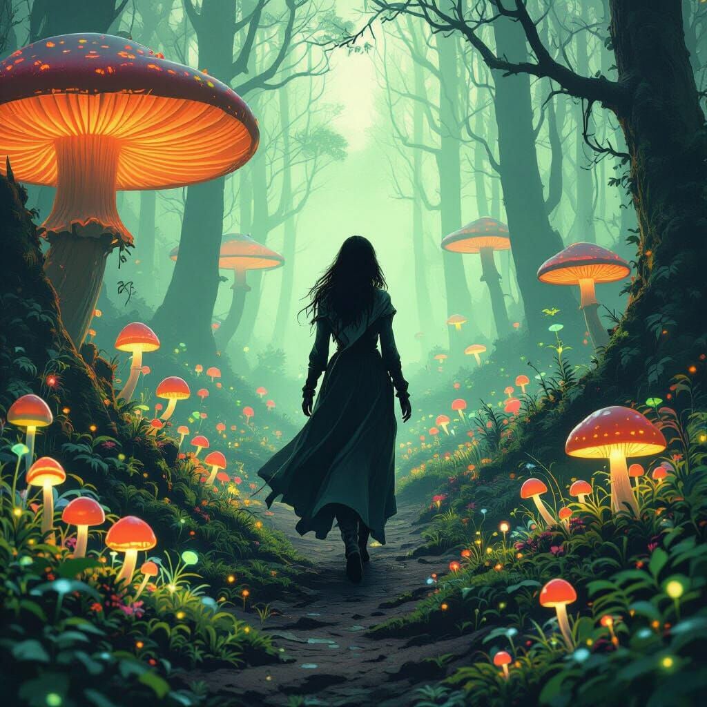 A striking picture of a woman walking in a magical forest. The forest is filled with glowing mushrooms and plants, set against a misty backdrop, in a fantasy art style.