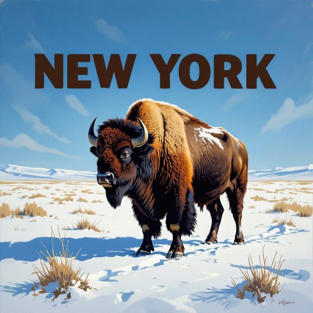 This image features a powerful buffalo standing on a snowy prairie, with bold 'NEW YORK' lettering visible in the background, set against a striking blue winter sky.