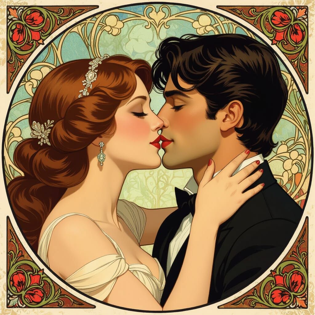 This image shows a beautiful woman with lipstick kissing a handsome man. The romantic embrace is rendered with delicate details and vibrant colors, in an art nouveau style.