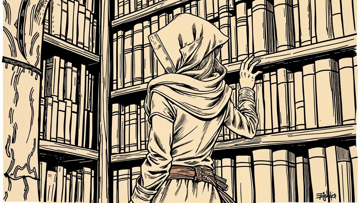 A confident female elf stands in a medieval dungeon, searching through a vast bookshelf with a cinematic pose, captured in a beautiful sepia ink drawing with comic book style kinetic lines.