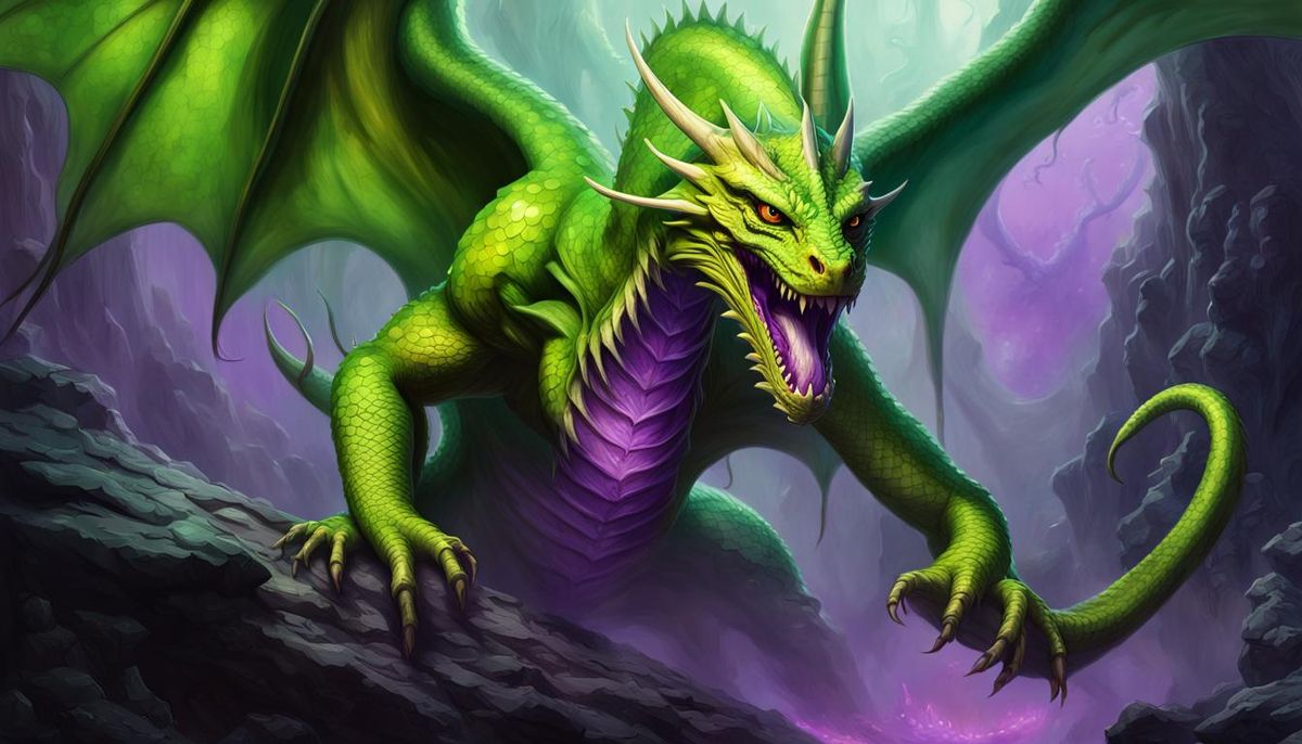 A full body image of a huge, yellow and green dragon with purple highlights spewing bright green acid. This detailed fantasy art features a dragon in a Dungeons and Dragons style.