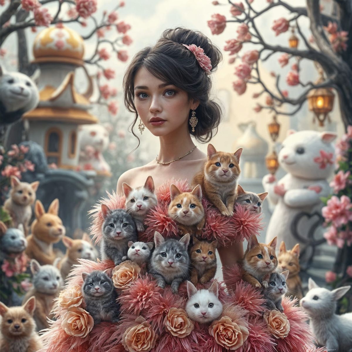 This image depicts a beautiful woman wearing a dress made of happy, fluffy animals. The hyperrealistic image showcases an intricate and detailed scene filled with life and humor.