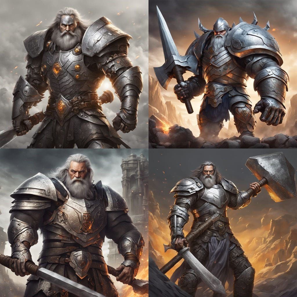 This image depicts a colossal warrior clad in shimmering silver armor, his amber eyes and hair a striking contrast to the darker tones of the fantasy world. He wields a massive hammer, exuding power and strength.