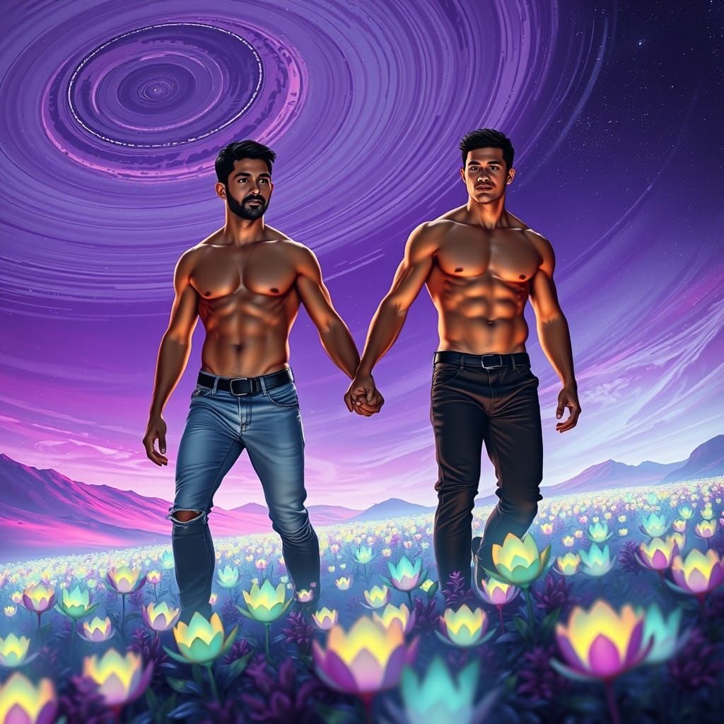 A captivating image of two young men on an alien world, wandering through glowing flora under swirling purple skies. The scene evokes cosmic art with surreal and vibrant elements.