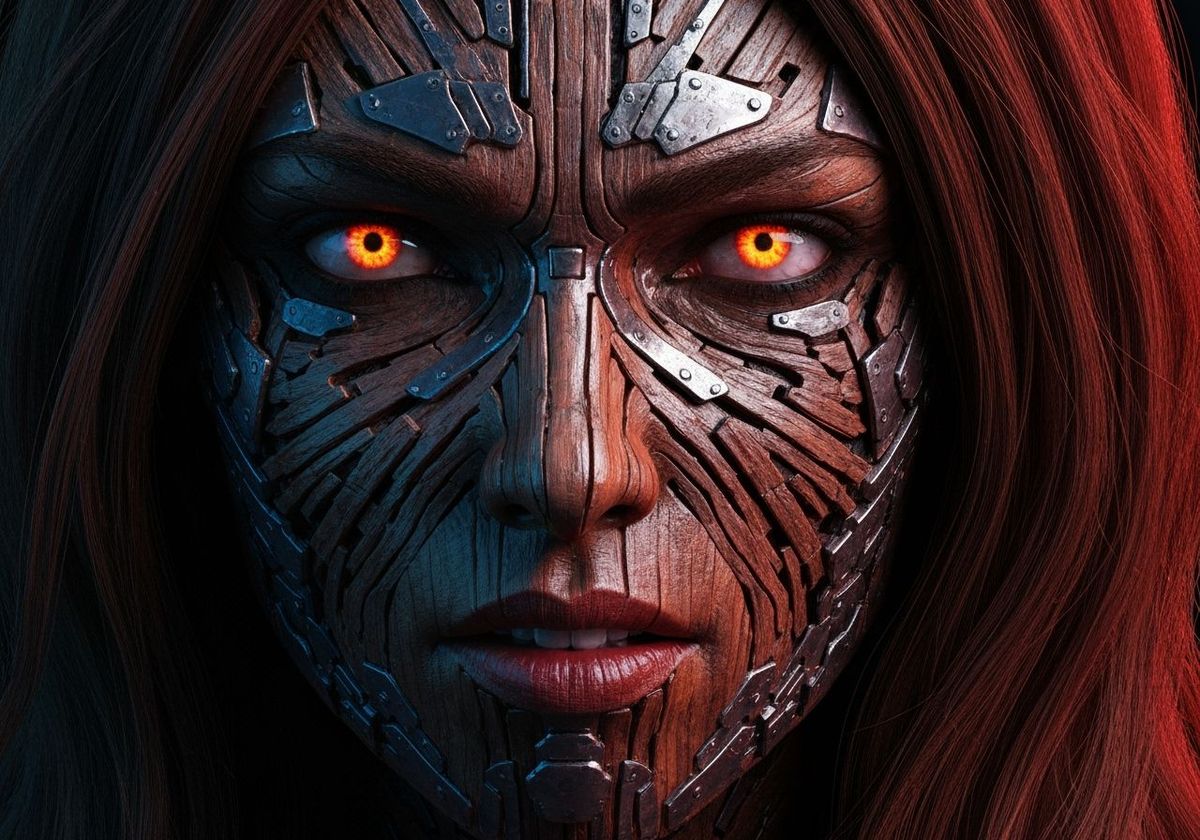 A photorealistic 3D render of a furious woman's face, crafted from steely, apocalyptic wood. Her eyes radiate power, set against a backdrop of dramatic lighting and intense colors.