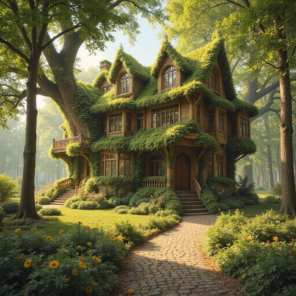 This enchanting image depicts a serene, organic mansion crafted from living trees, adorned with lush summer leaves and warm, golden hues, evoking a sense of peaceful tranquility reminiscent of idyllic landscapes.