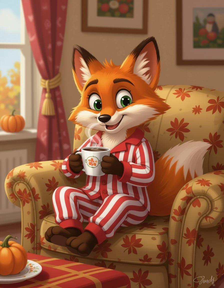 This image shows a cute fox in pajamas relaxing on a sofa with coffee. The room is decorated for autumn with pumpkins and leaves, in a classic comic book style.