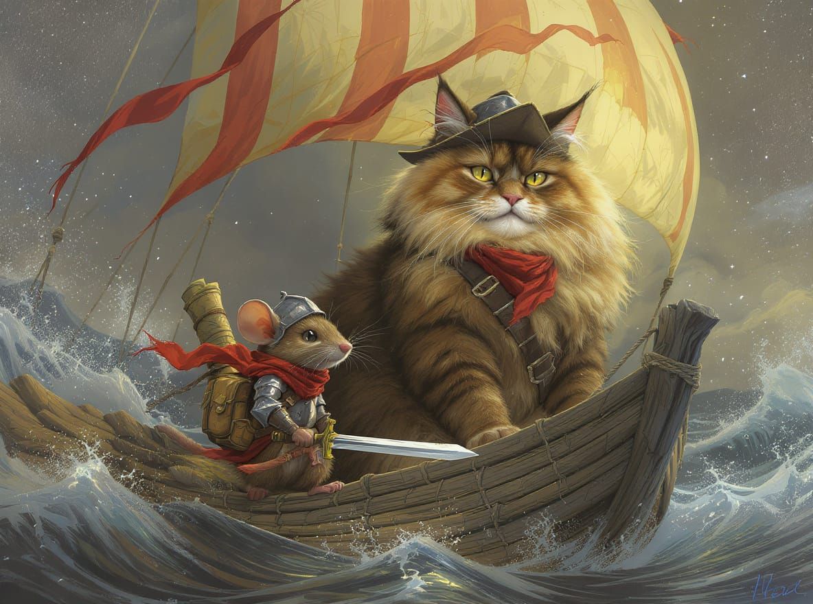 A digital painting of an anthropomorphic mouse knight and cat companion on a raft. The pair sail on a wild sea under a cloudy sky, illustrated with dramatic lighting in a cinematic fantasy style.