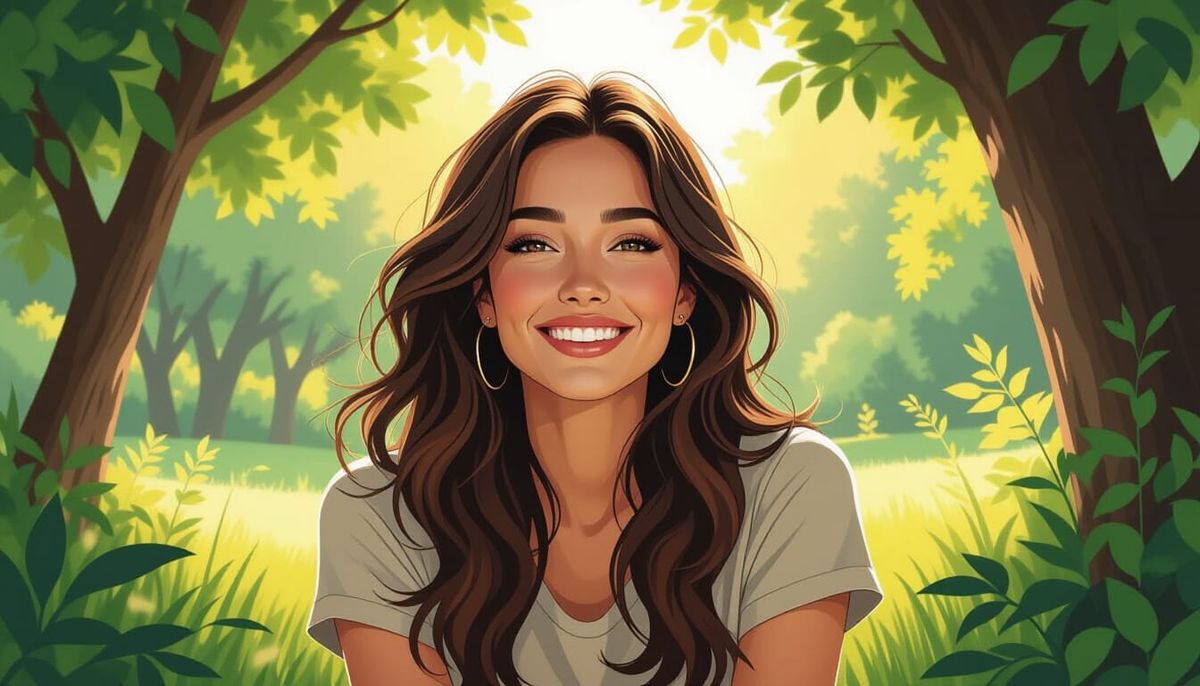A portrait of a smiling brunette woman with long wavy hair, enjoying a sunny day in a park filled with lush greenery. The image blends clean lines, gritty details and vibrant colors.