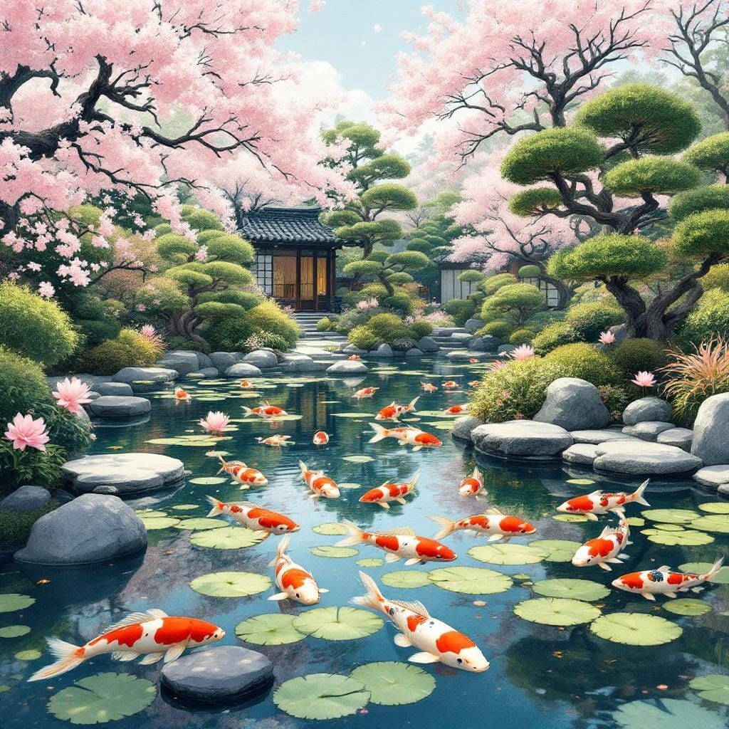 A hyperrealistic image of a koi pond in a Japanese garden. Colorful koi swim among lily pads under falling cherry blossoms. The scene is rendered with soft colors and intricate detail.
