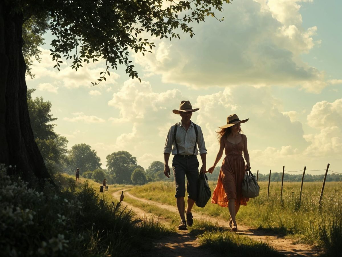 This image shows a serene summer landscape with two figures strolling in the countryside, rendered in a dramatic chiaroscuro style reminiscent of 17th-century Dutch masters.