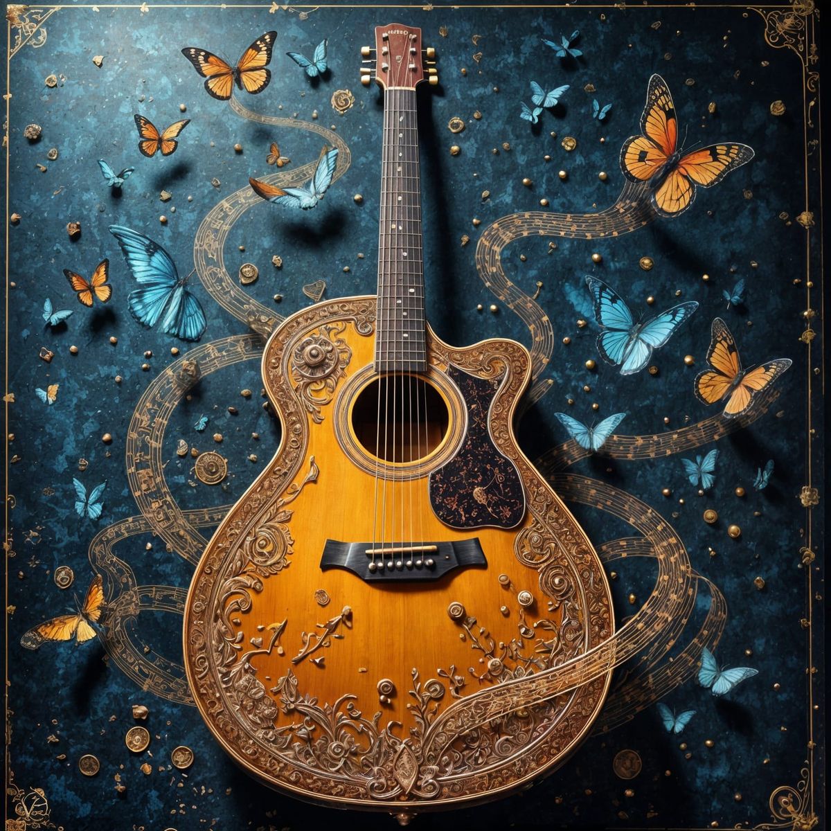 A breathtakingly detailed image of a guitar, surrounded by swirling musical notes, set against a blueprint backdrop, with a cinematic feel and vibrant colors, evoking a sense of epic grandeur and artistic mastery.