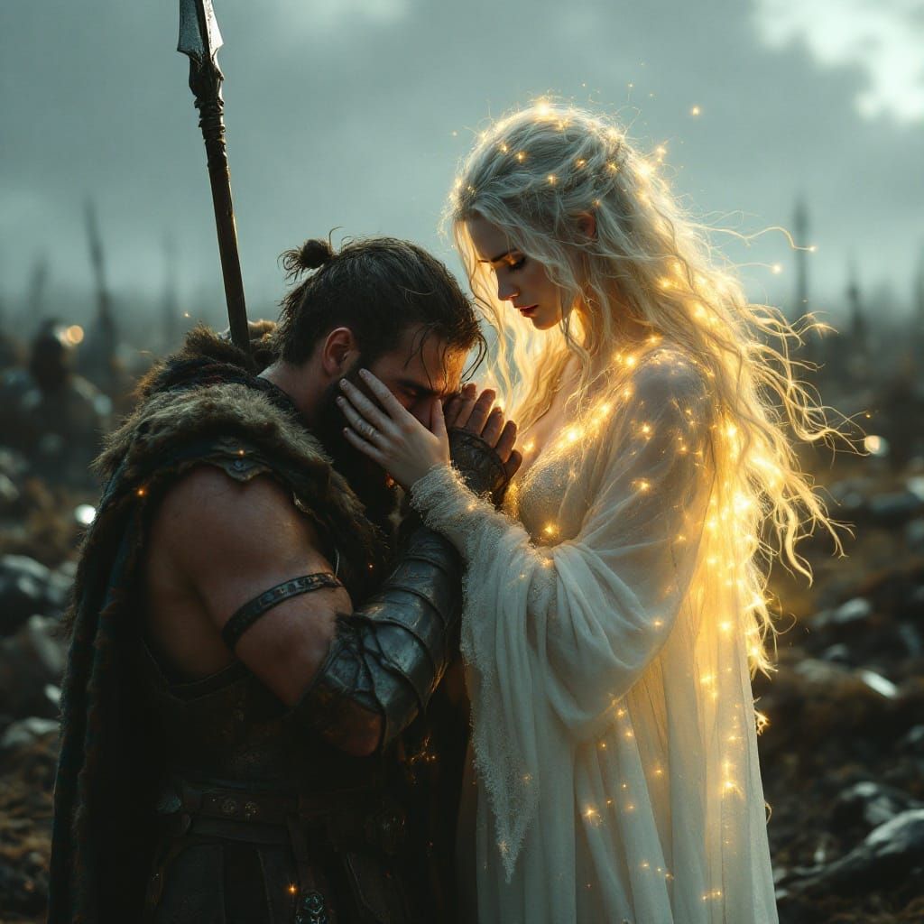 A poignant moment on a ravaged Dark Ages Celtic battlefield, a Celtic warrior is comforted by a spectral vision of loveliness, symbolizing hope and solace amidst the chaos and carnage.
