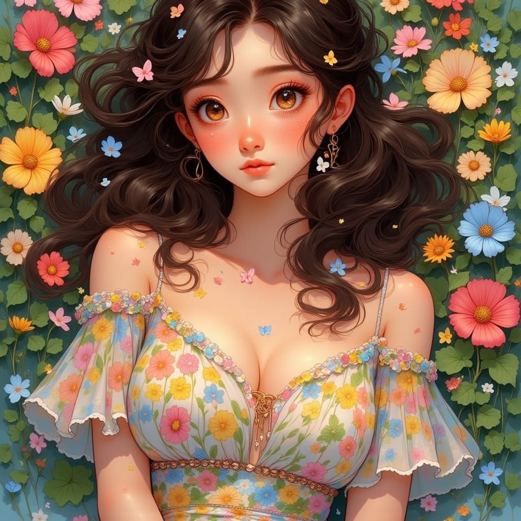 A beautiful brunette woman with distinctive beauty marks lies in a flower garden. Her floral dress and the surrounding petals evoke the art nouveau style with soft, dreamy, whimsical illustration.