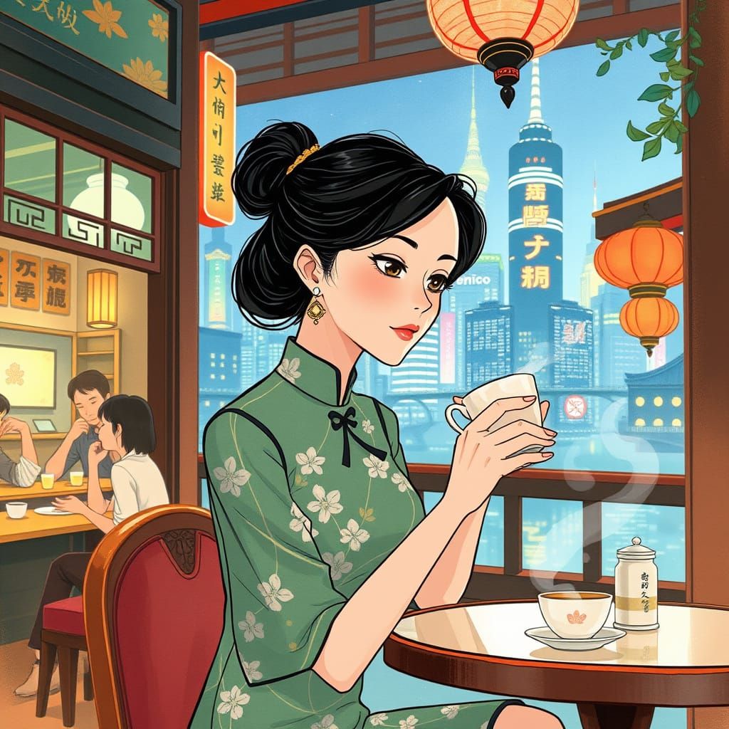 A Ghibli-style animation of a woman in a cheongsam enjoying tea. The scene blends a traditional tea house with a futuristic cityscape in watercolor.