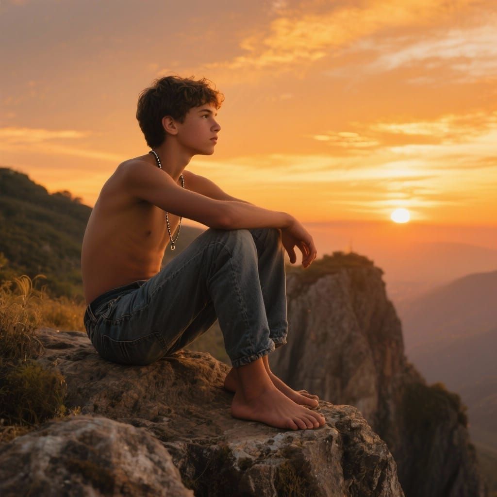 This photograph captures a young man sitting on a cliff at sunset. The warm golden light illuminates the scene, creating a cinematic and intimate atmosphere.