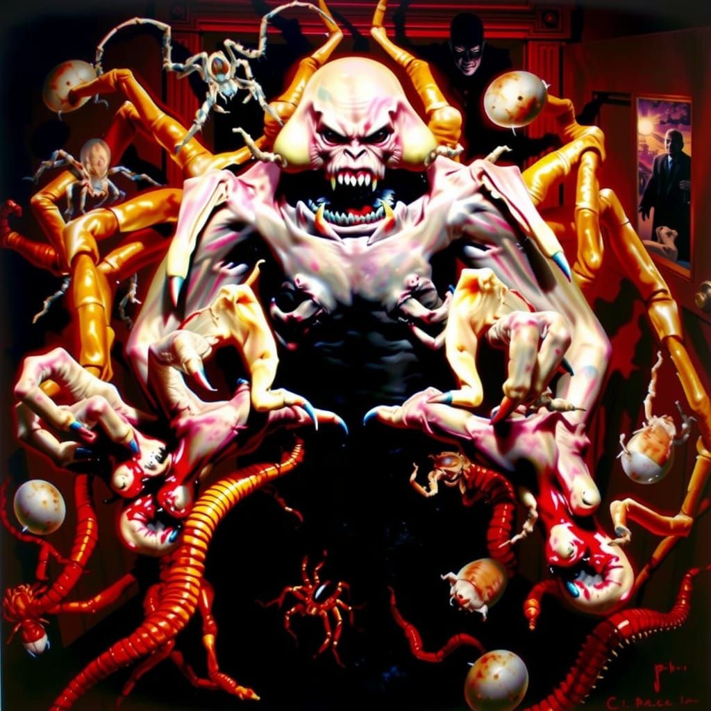 A frightening, towering creature with grotesque features dominates a shadowy bedroom scene. The image is reminiscent of dark surrealist art with a focus on nightmarish figures and a chilling atmosphere.