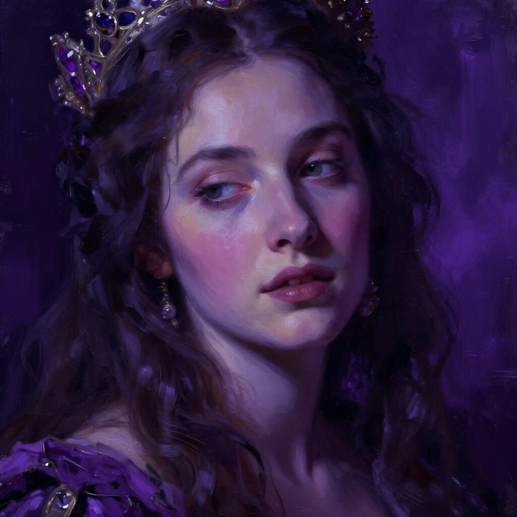 This image is an extreme close-up portrait of a woman with a melancholic expression, rendered in the dramatic Baroque style with rich purple hues and impasto texture.