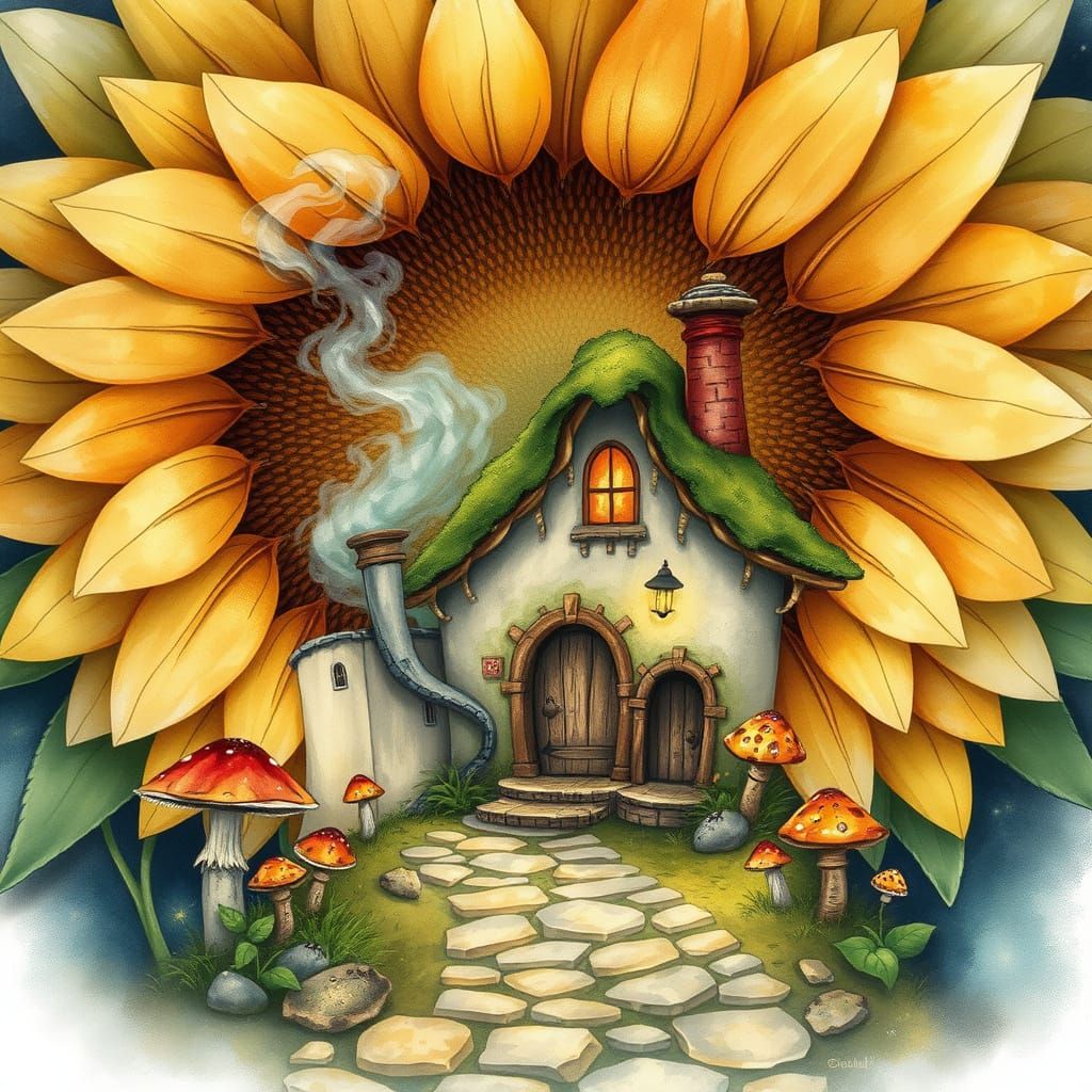 A serene watercolor painting of a charming cottage nestled within a giant sunflower's blooming center, surrounded by glowing mushrooms, twinkling fireflies, and a cobblestone path, evoking a dreamy and ethereal atmosphere reminiscent of fantasy concept art.