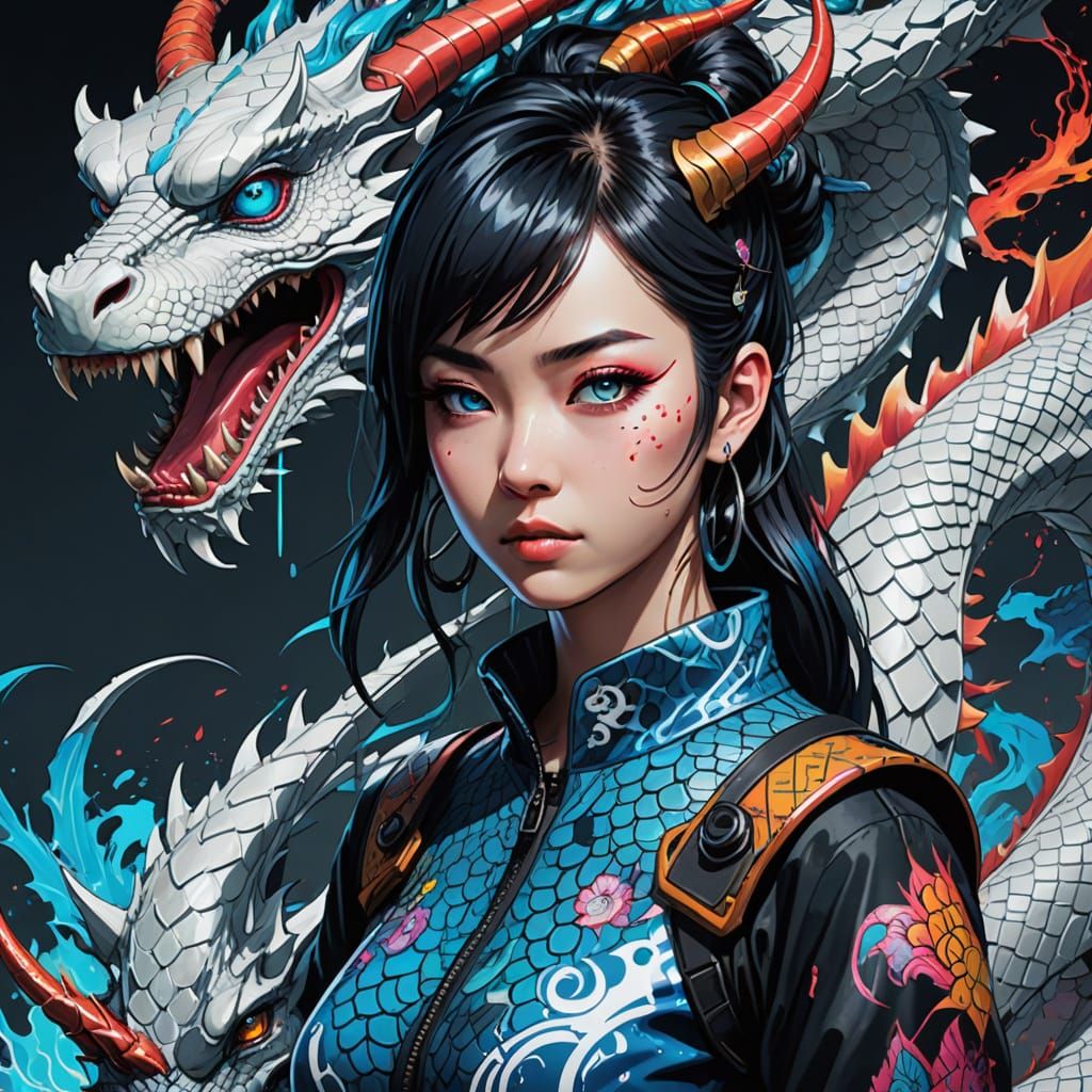 This image shows a full-body portrait of a Japanese girl with dragon horns and colorful tattoos. She is surrounded by dragons in a cyberpunk aesthetic, rendered as vibrant line art in 8k resolution.