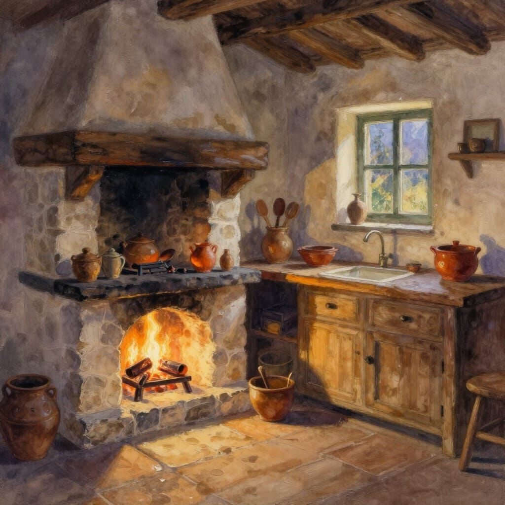 This image depicts a tranquil, rustic kitchen with a warm hearth, handcrafted items, and twilight ambiance. Rendered in a textured gouache and watercolor style with thick brush strokes.