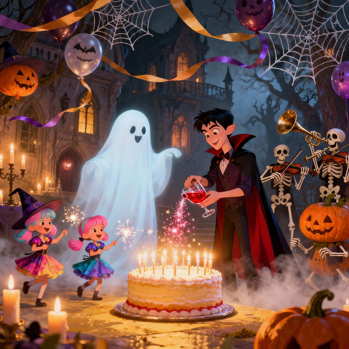 This image shows young Halloween creatures enjoying a whimsical birthday party in a haunted mansion. Features vibrant, smooth animation with playful characters.