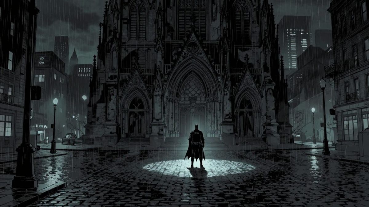 A dramatic, rain-slicked Gotham City night scene features a gothic church and a watchful Batman silhouette. Rendered in a dark, noir comic style with stark lighting and desaturated colors.