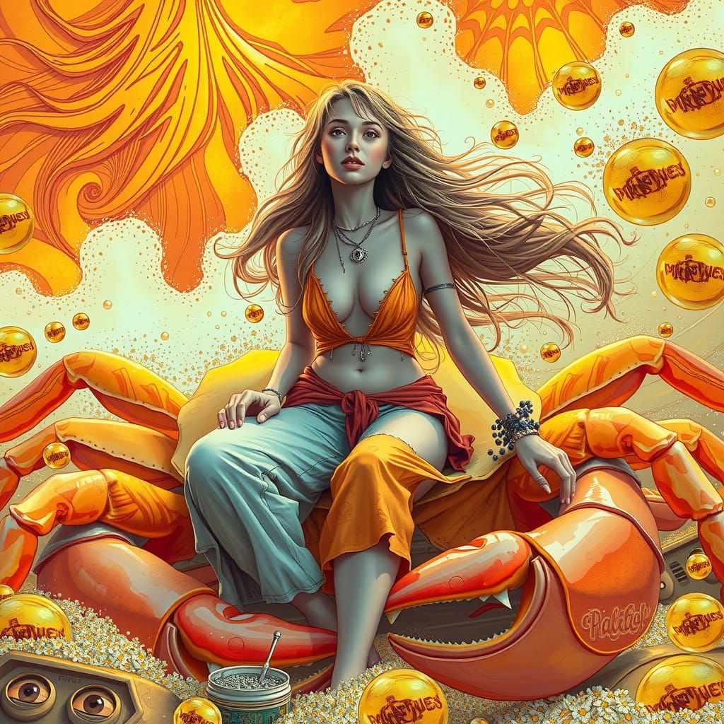 This image shows a woman with golden hair and bohemian clothing, seated on a gummy crab in a sea of soda. The scene is rendered with neon futurism, eerie mist, and whimsical lines, creating a surreal world.