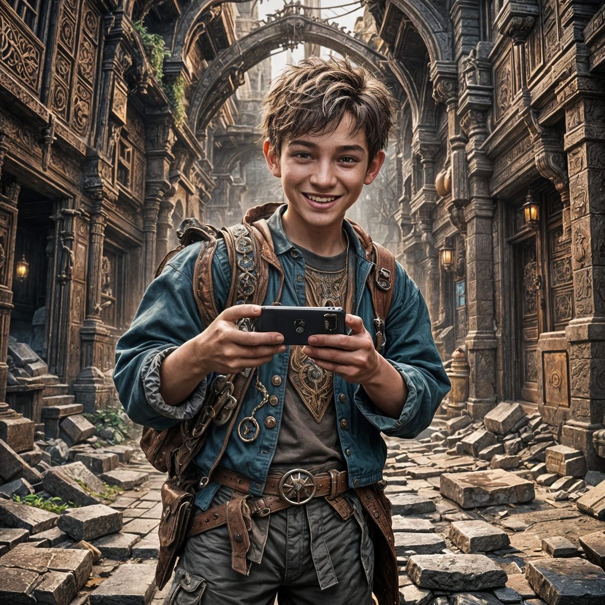 This image shows a boy smiling while holding an iPhone. The artwork features deep colors and intricate details, resembling a matte painting with fantasy concept art elements.