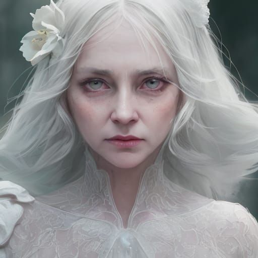 A photorealistic close-up of an old woman with milky eyes, a black cat on one shoulder, and a white ray on the other. Delicate water drops and ethereal light enhance intricate details, captured with cinematic color grading.