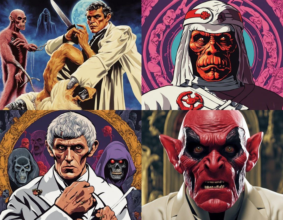 This image shows a bizarre, high-definition mutant ape horror performing a karate chop. The creature blends elements of Abominable Dr. Phibes in a grotesque, frightening style.