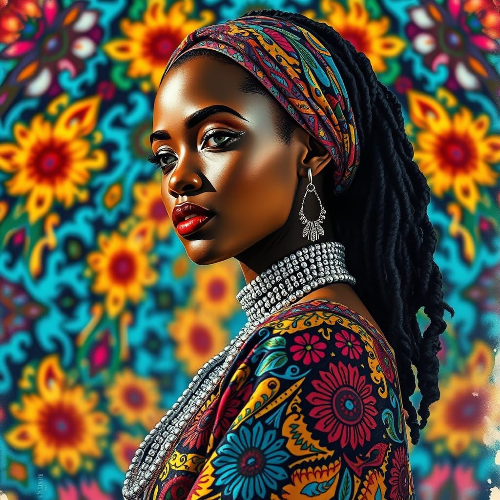 A striking picture of an African woman in colorful clothing. The portrait features dynamic lighting, intricate details, and expressive brushstrokes in an elegant, curvilinear art nouveau style.