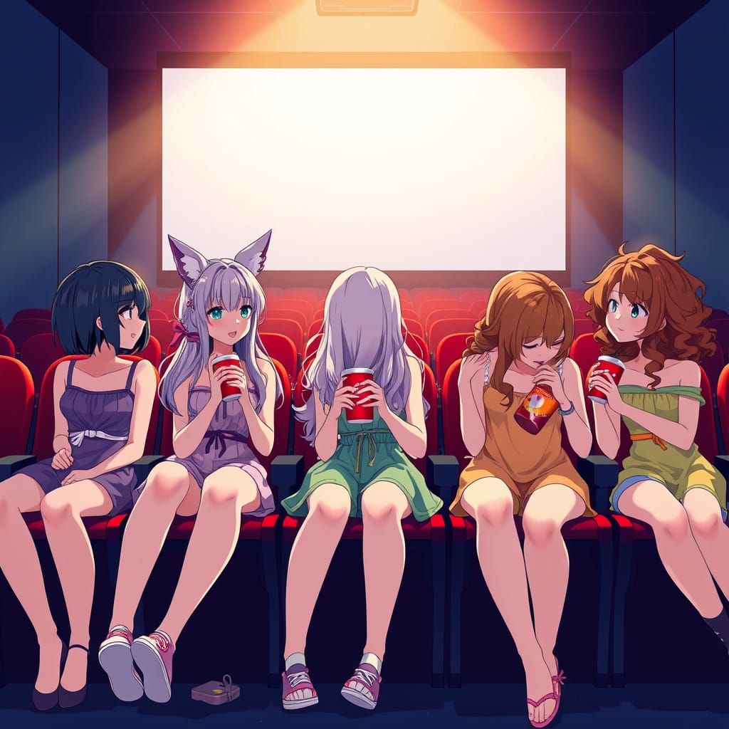 This image shows five cute women in summer attire enjoying a movie in a vibrant anime style. The cinematic lighting and cel-shaded textures evoke the feel of a manga scan.