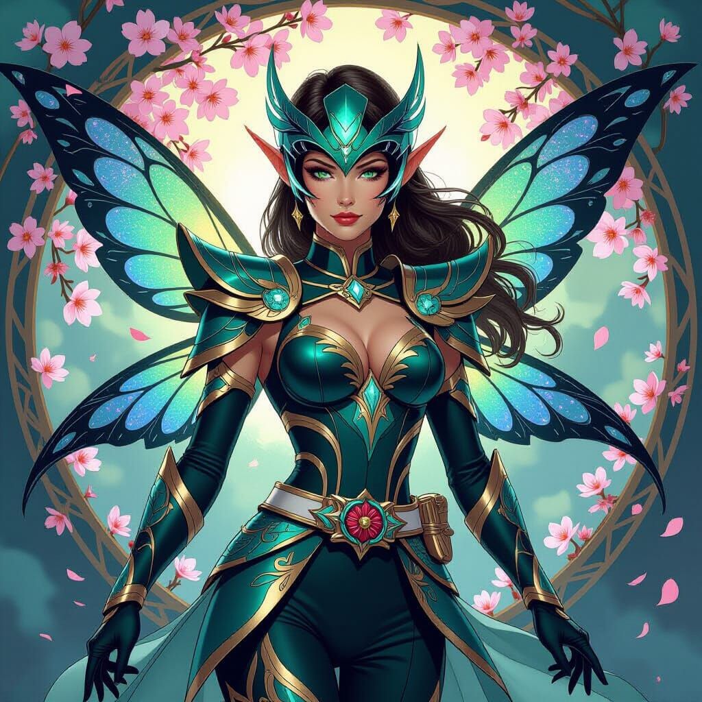 This image depicts a fairy Power Ranger with cherry blossom armor in black and teal. Features intricate floral details, iridescent lighting, and a dynamic, heroic stance, rendered in a classic illustration style.