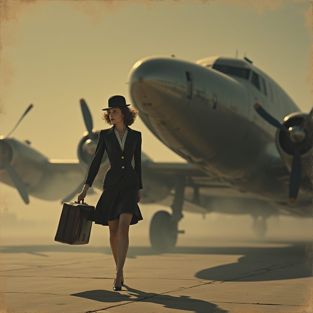 A striking picture of a woman in a 1940s suit leaving an airplane with a briefcase. The image features dramatic shadows, sepia tones, and vibrant color accents with a vintage aesthetic.