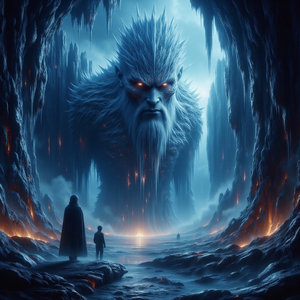 This image shows a vast, hidden civilization under Antarctic ice, featuring colossal gothic ruins and glowing runes. Subterranean caverns are lit by molten gold in a cinematic digital painting style.