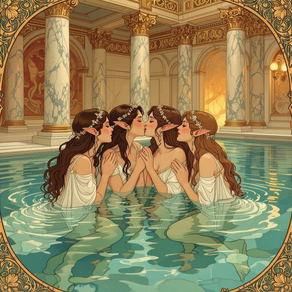This image shows five elven women in white tunics enjoying a Roman bathhouse with golden lighting. Two are sharing a kiss, rendered with art nouveau details and lush, vibrant colors.