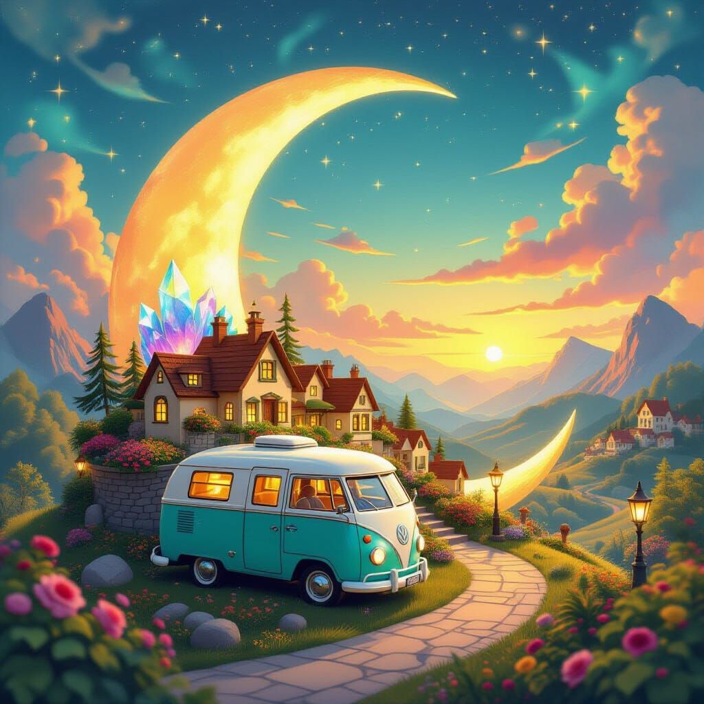 This image shows a miniature village nestled inside a crescent moon. The scene is detailed and colorful, with crystal caves and glowing flora. The vortex tunnel uses impasto techniques to create texture.