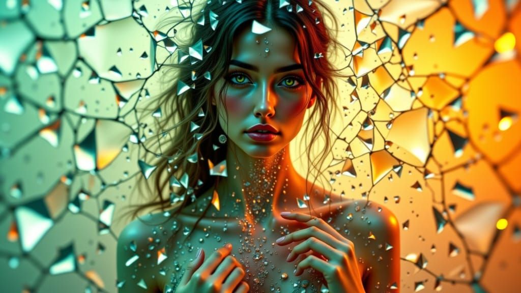 A lonely woman repairs a shattered mirror with delicate stitches. This image evokes a dreamy, ethereal quality, with intricate lacework and vibrant, kaleidoscopic colors in a digital art style.
