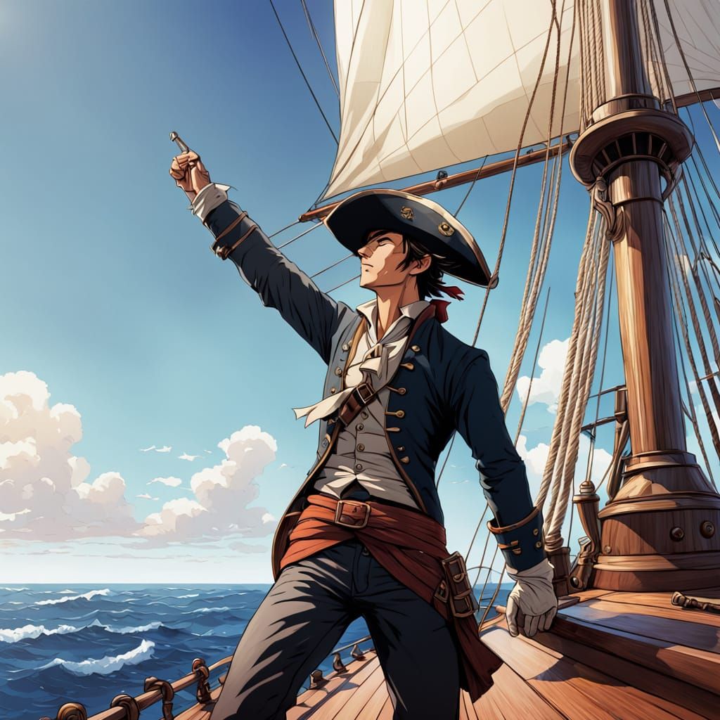 A vibrant manga-style image of a young sailor in a tricorn hat, gazing out at the ocean from the rigging of a sailing ship, on a bright, clear day with perfect lighting.